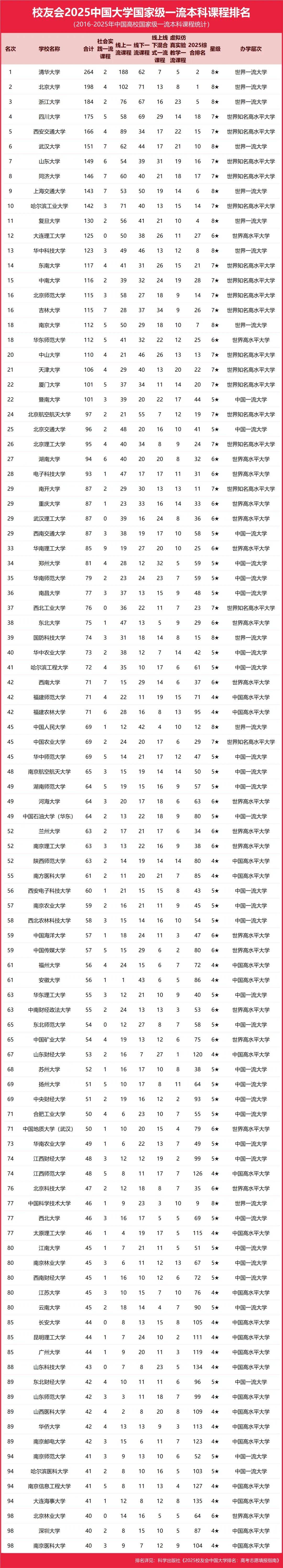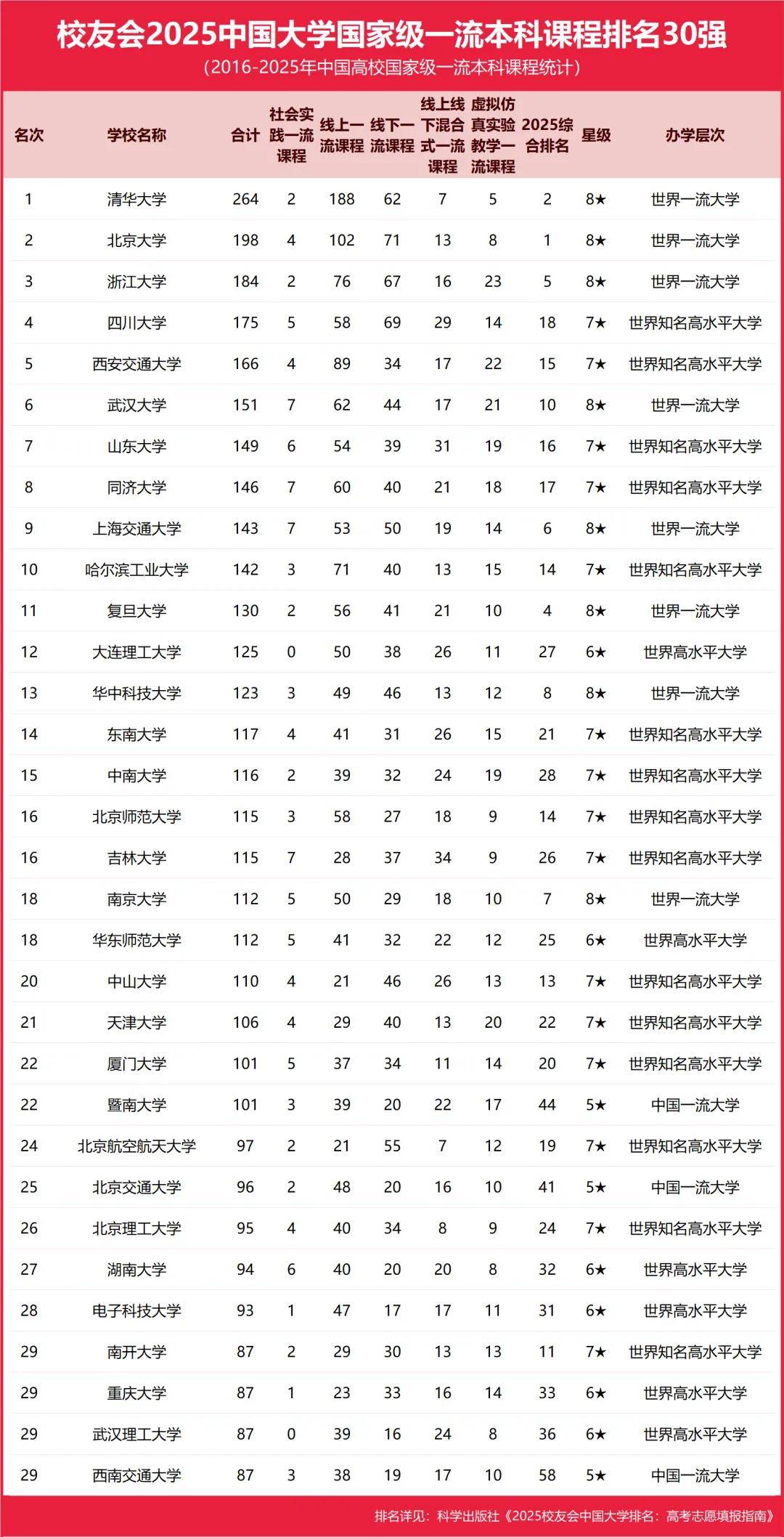 校友会2025中国大学国家级一流本科课程排名,清华大学、齐鲁理工学院第一