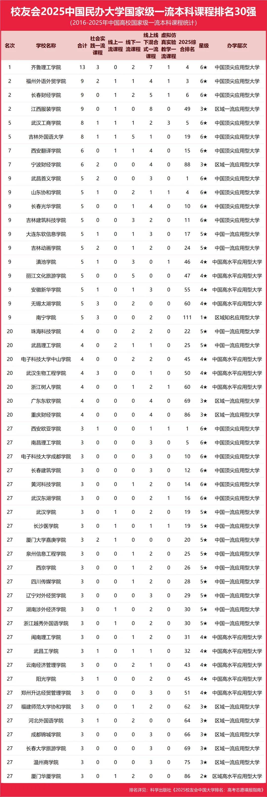 统计显示,齐鲁理工学院共有13门课程(第一建设单位)入选国家级一流本科课程,全国最多,居全国第341,雄居校友会2025中国民办大学国家级一流本科课程排名冠军。福州外语外贸学院、长春财经学院和江西服装学院各9门,并列第二。武汉工商学院和吉林外国语大学各8门,并列第五。西安翻译学院和宁波财经学院各6门,并列第七。武昌首义学院、山东协和学院、长春光华学院、吉林建筑科技学院、大连东软信息学院、吉林动画学院、滇池学院、丽江文化旅游学院、安徽新华学院等各5门,并列第九。