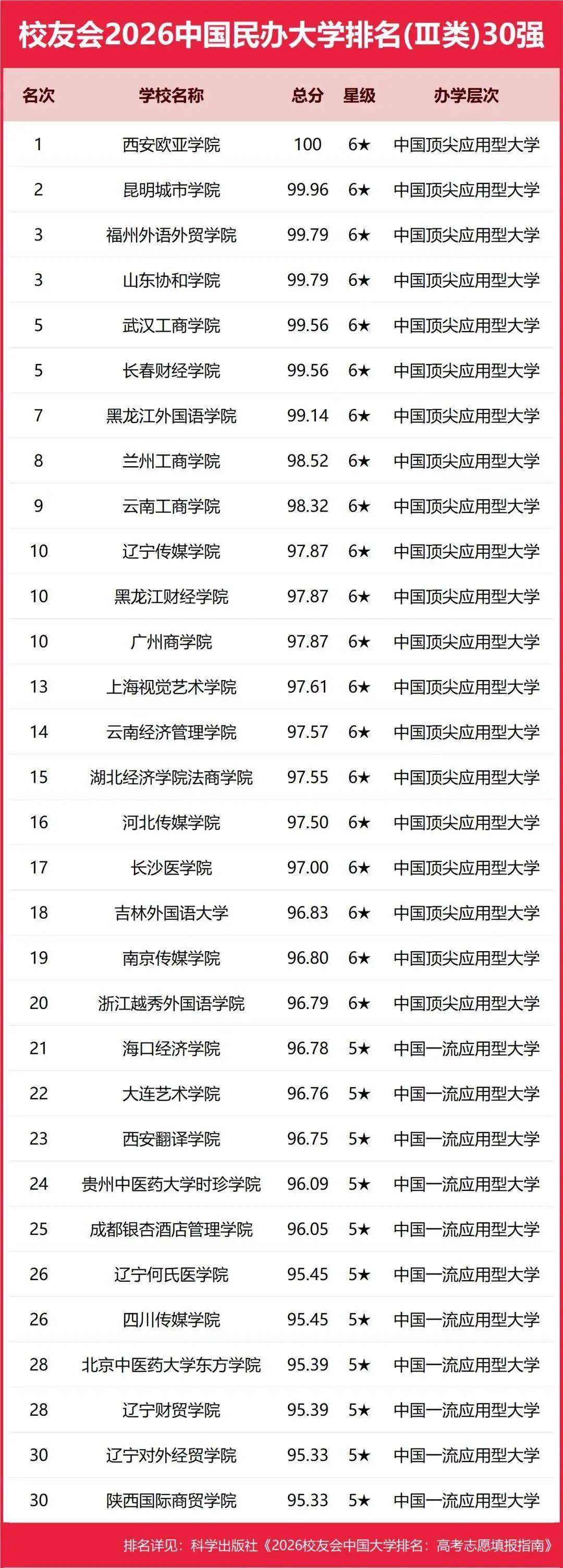 西湖大学、武昌首义学院、三亚学院、西安欧亚学院、广州南方学院雄居校友会2026中国民办大学排名第一。西交利物浦大学、宁波诺丁汉大学与香港中文大学(深圳)雄居校友会2026中国合作办学大学排名前3强。江西应用技术职业学院、合肥职业技术学院与浙江金融职业学院雄居校友会2026中国高职院校排名第一。深圳职业技术大学、海南科技职业大学与河北科技工程职业技术大学雄居校友会2026中国职业技术大学排名前3强。